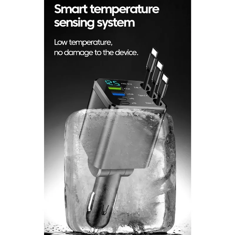 Keep all your devices powered while driving with this 7-in-1 Retractable Car Charger. Designed for convenience and speed, its retractable cable system keeps your car clutter-free, while multiple USB and Type-C ports let you charge several devices at once. Perfect for road trips, daily commutes, or rideshare drivers.